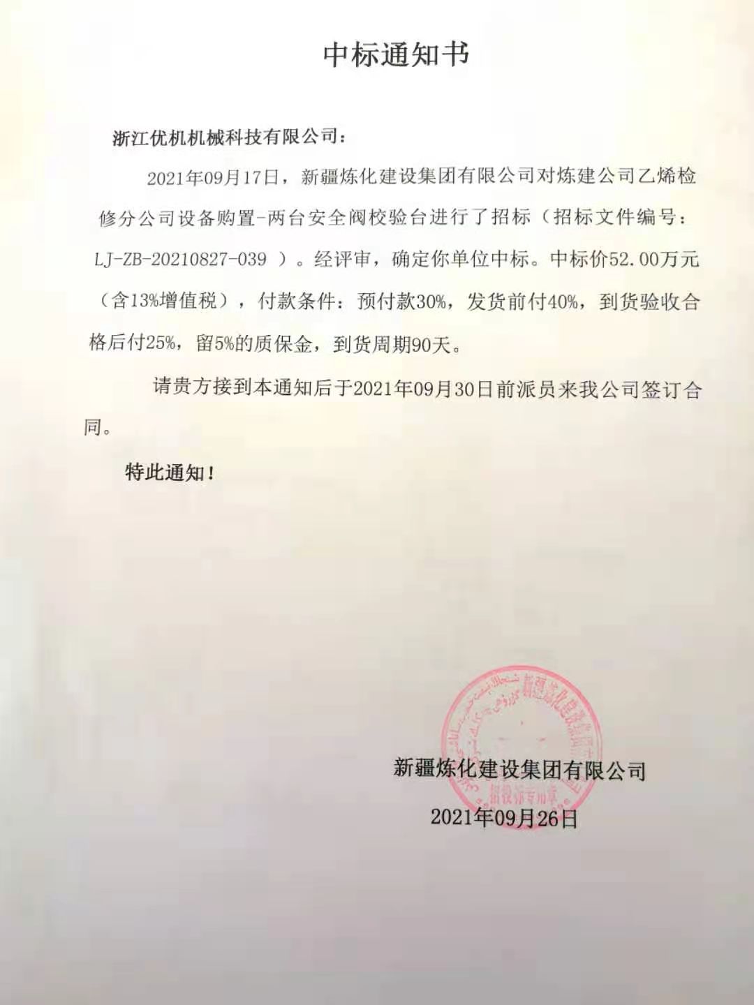 近期,新疆煉化建設(shè)集團(tuán)有限公司發(fā)出中標(biāo)通知書,宣布通知浙江優(yōu)機(jī)機(jī)械科技有限公司,二次添加設(shè)備購置項(xiàng)目-兩套安全閥校驗(yàn)臺(tái),經(jīng)評(píng)審確定中標(biāo)(招標(biāo)文件編號(hào):LJ-ZB-20210827-039),合計(jì)一期和二期閥門檢測校驗(yàn)設(shè)備總數(shù)達(dá)到11臺(tái)(套)金額貳佰多萬,該項(xiàng)目是浙江優(yōu)機(jī)機(jī)械科技有限公司主營產(chǎn)品進(jìn)入中石油樣本項(xiàng)目。